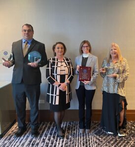 UCR Awards recognizing 2025 enforcement excellence were presented to the New York State Department of Transportation for the Highest Enforcement Efficiency Rate and Most Violations Issued; the Oklahoma Corporation Commission Enforcement for Most Improved Enforcement Efficiency Rate; and Officer Scott Grimm of the Illinois Commerce Commission Police as Top UCR Inspector. (Pictured from left to right: Conor Morgan accepting for New York; Elizabeth Leaman, UCR Board Chair; Kristen Burch accepting for Officer Scott Grimm of Illinois; and Crystal Stevens accepting for Oklahoma.)